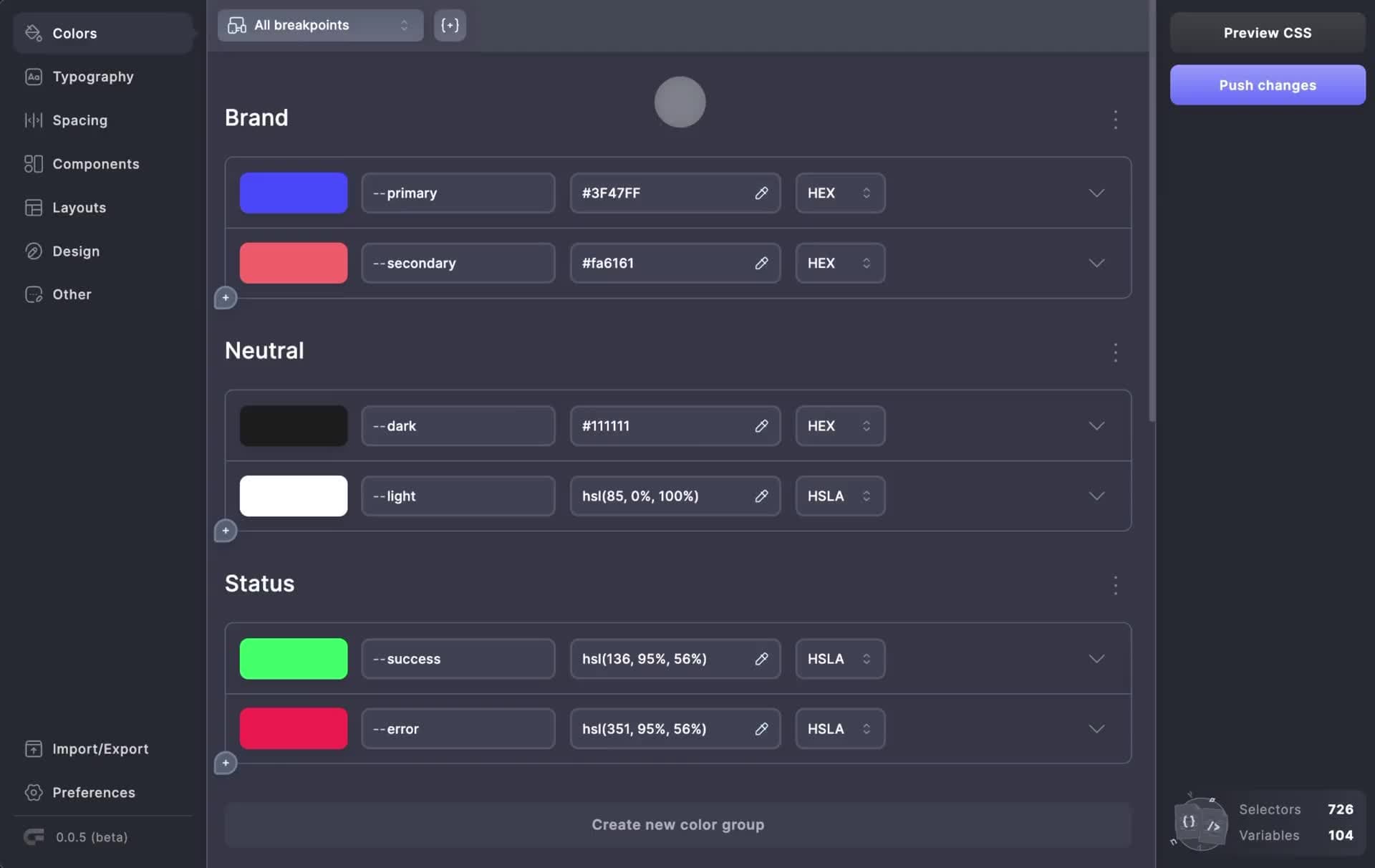 Step into the new era of UI color management. Add unlimited colors, organize them in groups, and generate lighter, darker and transparent color variants effortlessly.